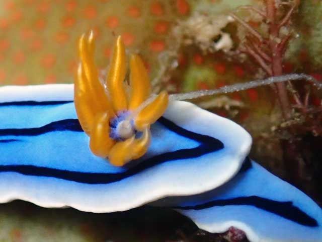 裸鰓目のウミウシの後ろの方に花のように咲いているのは、呼吸器である鰓、というのはダイビングの初期に教わることですが、次のステップとして、その中央の穴(肛門)にも注目してみてください!