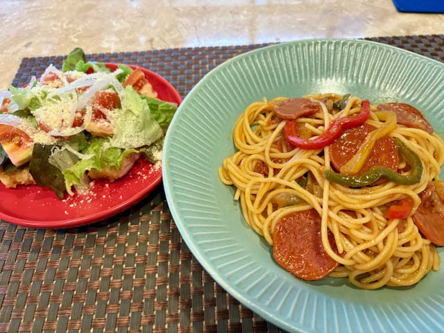 朝食は和食。ランチは、パスタですが日本で発明されたスパゲッティナポリタン。付け合わせはサラダではなくて、粉チーズと野菜の乗ったチキンのカツレツでした。