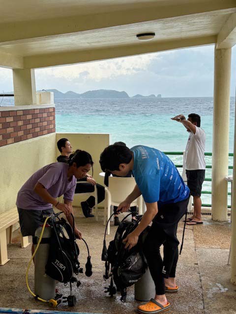 オープンウォーターダイバートレーニングも。ブリーフィングはマグダレナ敷地内で。トレーニングは半島反対側に車で10分ほど移動して行いました。
