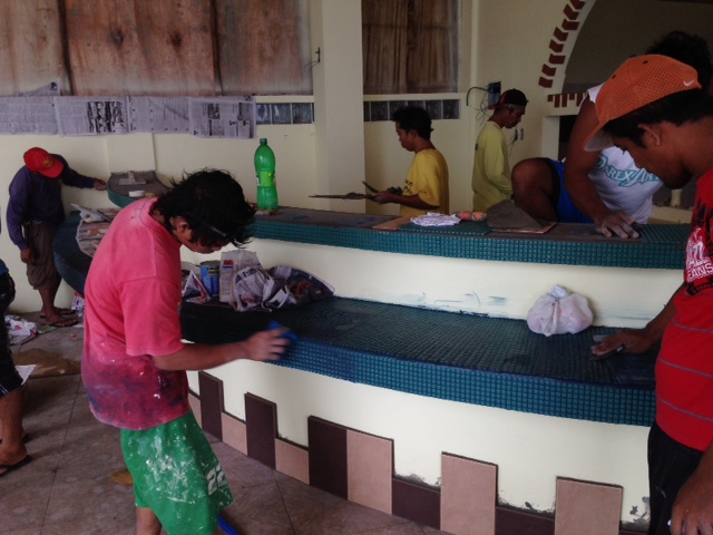 - カウンターのタイルも目地入れ。左官じゃない人まで手伝ってて、仕上がりがバラバラ。