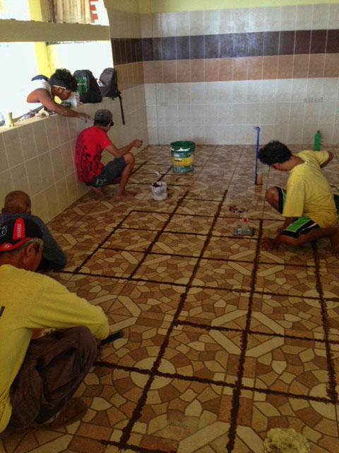 - キッチンの床タイル目地入れ。