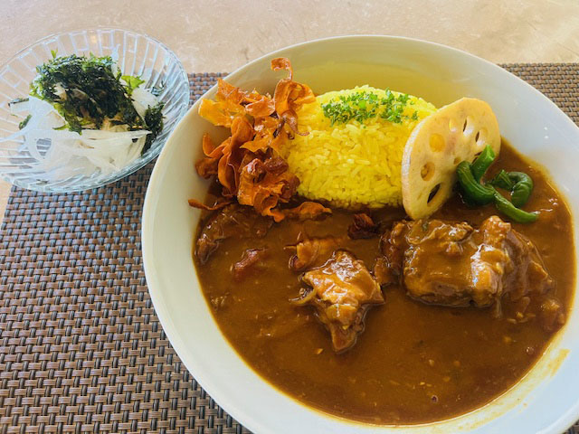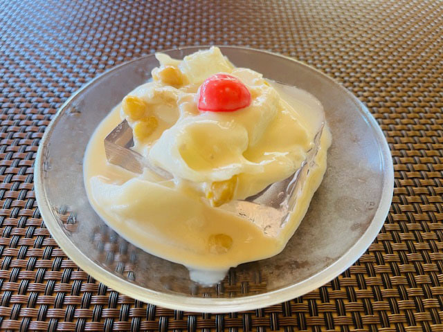 ランチは牛すじカレーと、ブコゼリー。若いココナッツのジュースをつかったゼリーですが、これこそ日本では食べられない一品ですね。ほのかな甘味のゼリーの上に、さらに今日はブコサラダの甘みマシマシ。果肉ものっていて、ゴージャスバージョンでした。