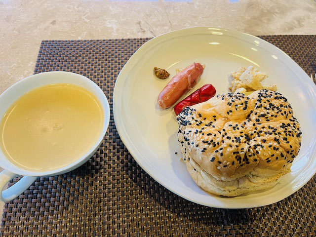 朝食は、ほうれん草サンドイッチ。見た目ただのごまパン?ですが、ソテーしたほうれん草ときのこが入っていて、ヘルシーです。