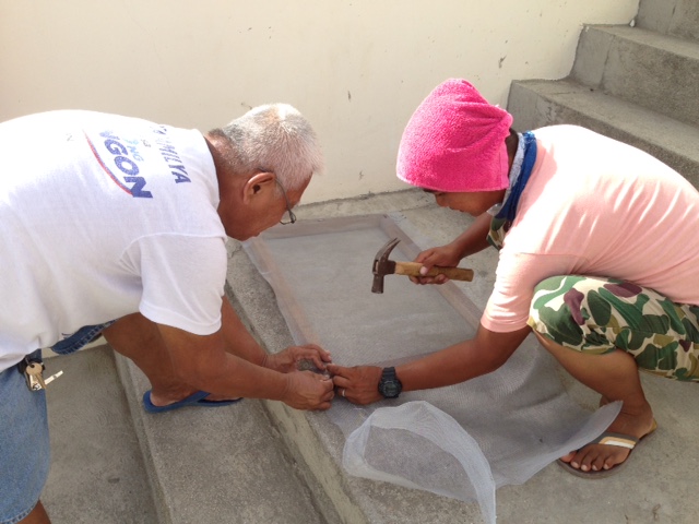 ダイニング側の窓を閉めることになったキッチンは、壁に空気とりの穴2つ追加。ついていたエアコンは使わないので撤去。ハエが入らないように網戸を付ける役目を仰せつかった珍念さん。