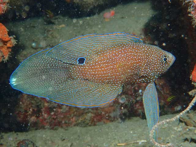シモフリタナバタウオは英語でComet。コメットって彗星ですね。シモフリタナバタウオ(Calloplesiops altivelis )は日本にもいるので、和名がついていますが、その外国在住のお仲間のアーグスコメット(英:Argus comet学:Calloplesiops argus)には和名がついていません。