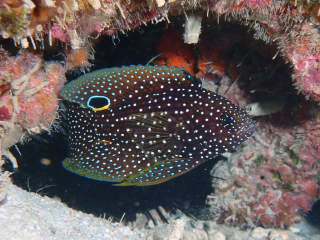 両者の違いは、アニラオではまずシモフリタナバタウオのほうが個体数が多いです。ので、暗がりに潜む、黒いボディで白点々の、背中に眼状斑のあるやつの9割方はシモフリタナバタウオさんです。