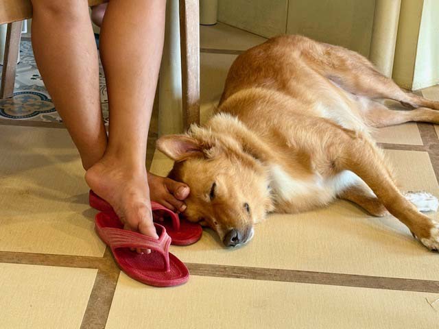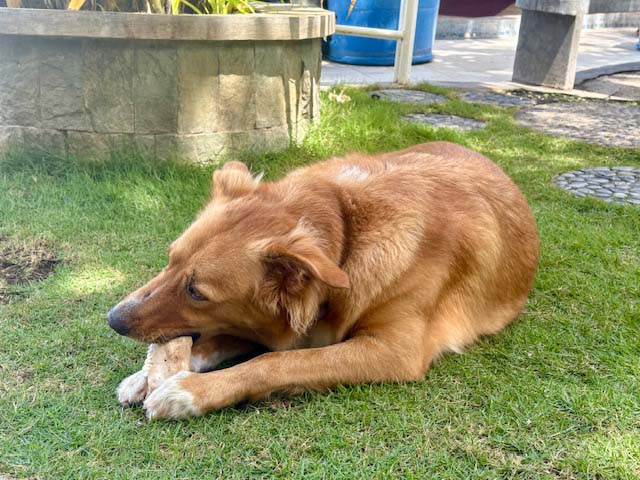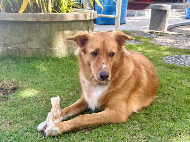 学生ボランティアのサラマットAさんたちがシークレットベイにスノーケリングに行った時に拾ってきた骨。どうみても犬の下顎骨ですが、お構いなしに齧る同族かみかみのベージュ。