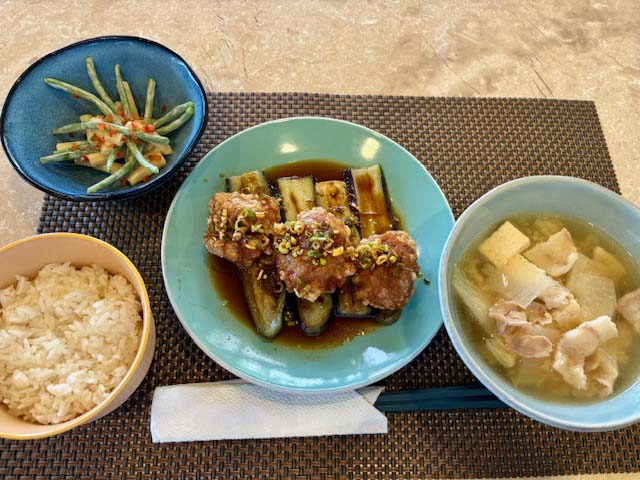 朝食は、ビーフパストラミハムレタスサンド。ランチは、油淋鶏でした。豚汁も沁みいります。