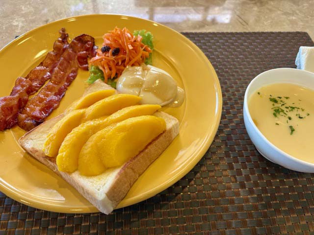 朝ごはんは、定番人気のマンゴートースト。昔は温かいフルーツなんて考えられませんでしたが、慣れた今では美味しいです。毎回マンゴーの味が少しずつ違うのが、楽しいです。