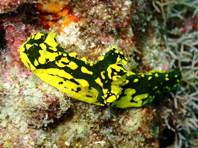 本日の出物は、キイロトラフウミウシ。アニラオではレアで、1年に一度見るかどうかといった、大きなウミウシです。で、本当にキイロトラフかなと図鑑を見てみると、以前は「キイロトラフ」だったのが、今は(2018年以降)「クロスジレモンウミウシ」と「フイリレモンウミウシ」の2種に分けられて和名がつくようになっているそうです。