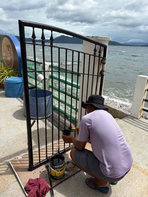 雨漏り箇所の天井交換は業者に依頼しましたが、ゲートのペンキ塗りなどの軽作業はスタッフの手で進めています。しかし海辺はよくものが錆びますね。