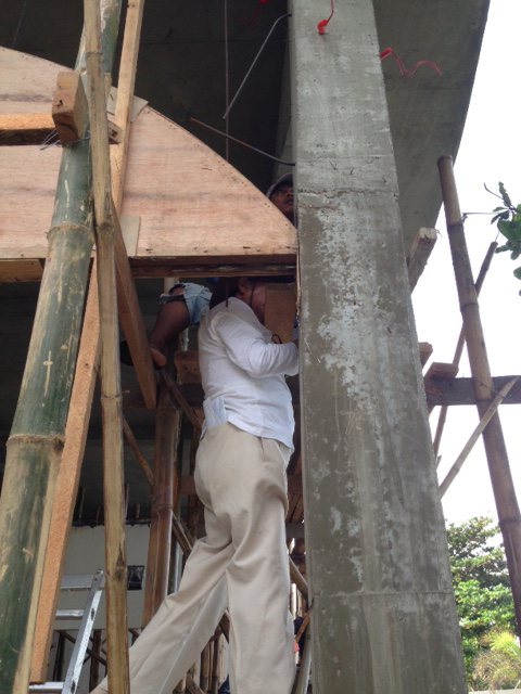 拡張ダイニング工事。古い梁はほぼ撤去完了。そして、お父さん、また登る。