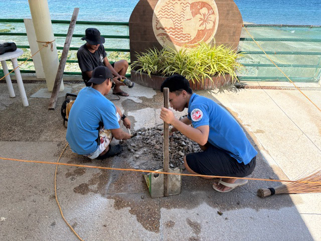 台風一過で天気も良かったので、リゾート内のメンテ作業。ダイブショップ前の準備をするエリアで、暑さでセメントが盛り上がってしまった知る人ぞ知る「もっこり」を修理しました。セメントを使うので、晴れている本日が狙い目です。