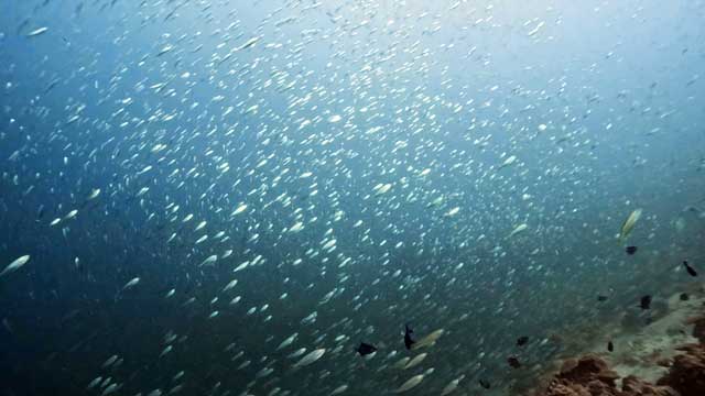 子どもたちを乗せた、午後のボートはダキエダへ。ダキエダといえば、穏やかで潜りやすい上にウミガメも多いので初心者向き。サンセットでニシキテグリ。流れが少ないので浮遊系ナイト向き。など、いろいろなイメージがありますが、ここ最近はそこにもう一つ追加で、小アジの群れがすごい、もあります。