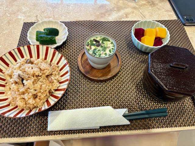 朝食は和風よりのアレンジ。台湾風おこわに、あさりの味噌汁、茶碗蒸し、きゅうりの浅漬けといった構成。茶碗蒸しは新レシピを採用で、しっとりなめらか仕上がりになりました。いつものも良いですが、これはこれでグーです。結構レストランっぽい。