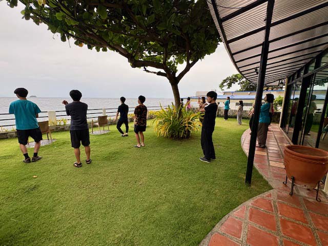6時55分、マグダレナの庭ではいつものラジオ体操。今朝も学生さんたち18人全員が元気に参加してくれました。
