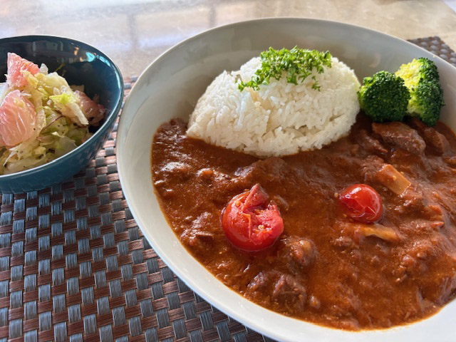 ランチはハヤシライス。実はしばらく前から、牛肉を「ストロガノフカット」という厚めカットの肉を使うようにしているんです。これがなかなか噛みごたえがあってリッチになった感じがします。