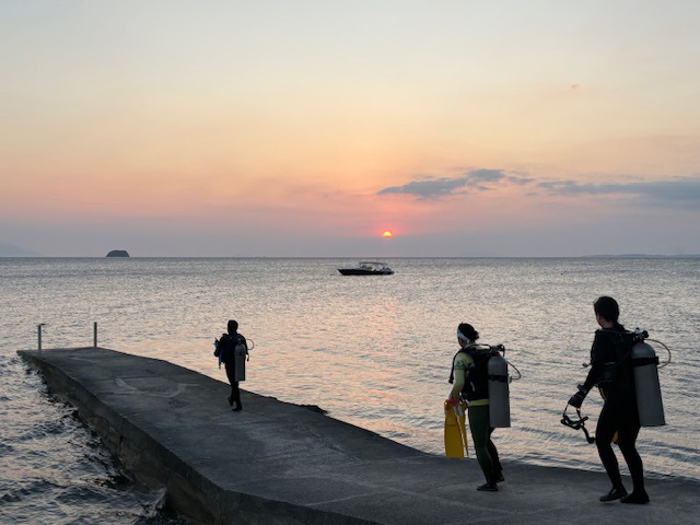 トレーニングのナイトダイブは、完全に暗くなってからいきなりエントリーするのではなく、日没の頃にエントリーして、潜っている間に自然と暗くなっていくというスタイルで行っています。