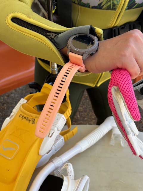 ガーミンやアクアラングなど、ダイブコンピューターには長めのバンドが付属しているものが多くあります。ドライスーツを使わない方・腕が細めの方は、短いバンドに替えるか、カットして調整することで格段に使いやすくなります。機材は「自分の体に合わせる」のが安全で快適なダイビングの第一歩。ぜひ見直してみてください!