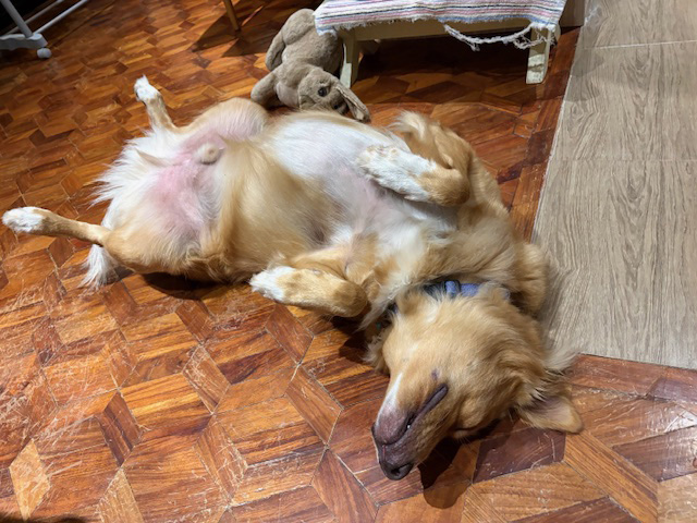 最近は日中の気温がかなり上がっており、人間だったら皮膚がひりつくほど(犬は毛で皮膚が守られているけど、どうなんでしょ?)。そんな日の夜はベージュもエアコンのきいた部屋でくつろぎたいようで、涼しい部屋でぐっすり朝5時まで熟睡しています。