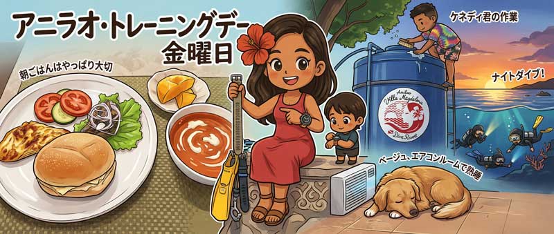 金曜日のアニラオです。 ボートダイビングはお休みで、終日トレーニングデーとなりました。アドバンスドオープンウォーターダイバーのコースがお二人、そしてエンリッチドエアダイバーのコースがお一人。合計3名の受講生とともに、充実した一日を過ごしました。
