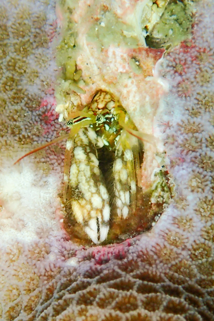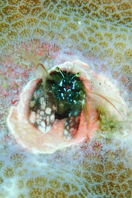 どの図鑑を見ても、ニシキカンザシヤドカリは爪の先が赤。ハウスリーフのこの子は爪の先がどれも赤くなかったです。