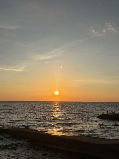 昨日のもよかったですが、今日はさらに上をいく美しさ。雲が少なく、水平線に沈んでいくオレンジ色の光が、海面をやさしく染めていました。