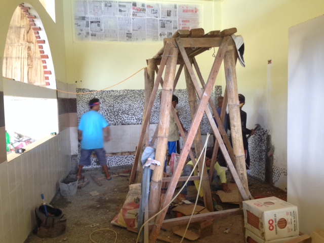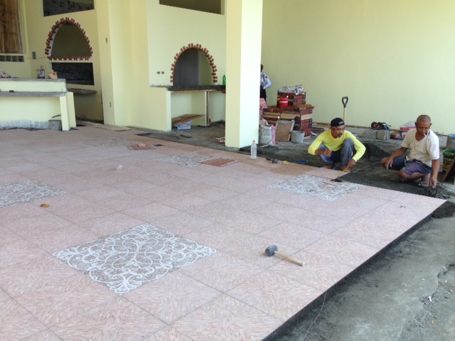 いい海況のアニラオです。ボートが出た後はハウスリーフで体験ダイビング。水温30度。 なかなかとるのが難しい、ふらつき者のオビテンスモドキの幼魚さん。 いい位置にいました。ナカソネカニダマシさん。 ウミウシライドのウミウシカクレエビさん。 ポートレート風ピグミーシーホースさん。水中写真提供ロボット刑事さん。ありがとうございました。 午前中皆さんが潜りにいってている間に、非番だったガイドのダンディーが床屋に変身。男の子スタッフ刈り上げてもらいました。 苦労者のダンディ。たくさんの仕事を経験してきた中に床屋もあったのだそうです。ダンディーと同じ髪型にしてもらいました。かといって、二人はできているわけではありません。 日曜日だけど、ワーカーさんに来てもらってタイル貼り続行しました。