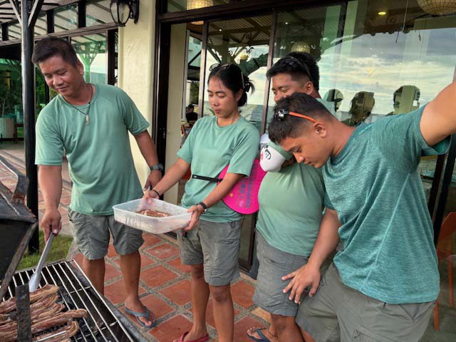 夜はバーベキュー。味付けなどはキッチンスタッフが担当し、焼き方はダイブショップの面々が担当。全員で焼いている様子を先日の戦隊モノ風に加工してみたら、謎のロボが出現。どうせならバーベキュー感のあるロボだったら良かったのに。