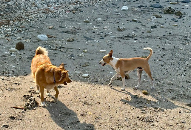 ダイバーの皆さんが出かけられたあと、海辺でベージュが細めの犬と戯れていたのですが、ガードマンが教えてくれました。「あの子とベージュは、父親違いの兄弟だよ」と。