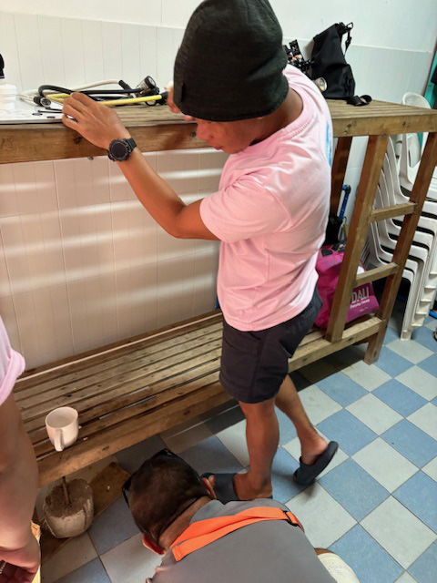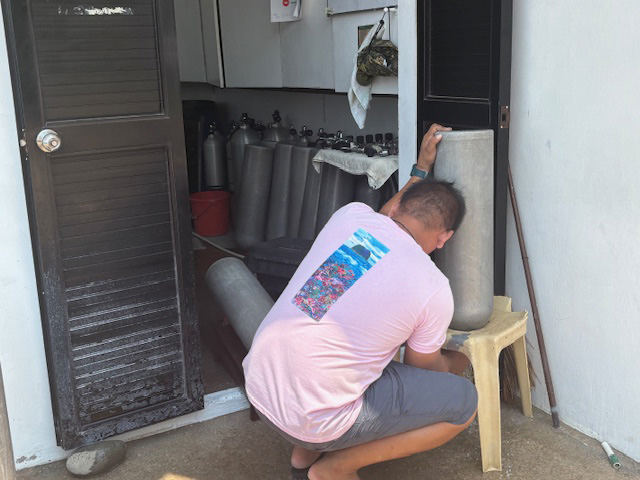 日曜日のアニラオはいつも通り、ガイドは7時45分くらいから準備開始です。でも、今日はちょっといつもと違う行動が。ほうきとちりとりを持ってダイブショップのガイド控室を掃除しているダンディ。