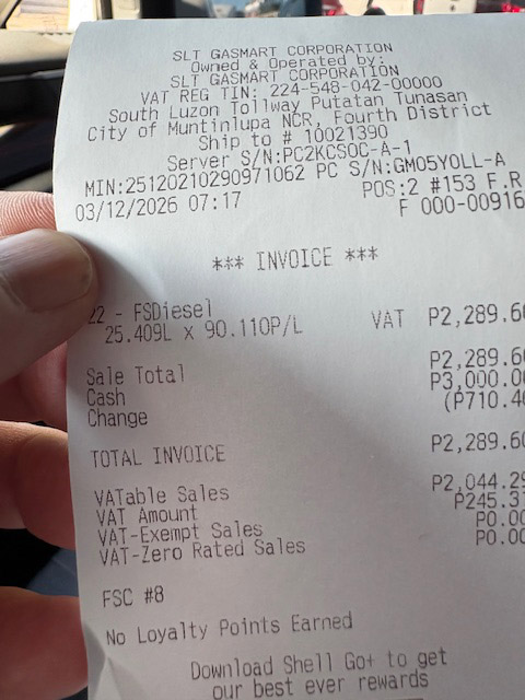 そういえば、今朝アニラオに向かう途中のガソリンスタンドで、いつもよりやけに高いなと思ってレシートを改めたところ、前回リッター61ペソだったディーゼルが、90ペソに!