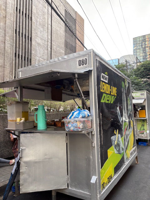 こういうコンテナのお店は路上にあって、近所のオフィスビルの人用に軽食やおやつを提供している、マカティエリアではおなじみの店舗形態。夜はコンテナを締め切って施錠してあります。コンテナ屋台みたいな感じ? マービンのお目当ては80番コンテナ。