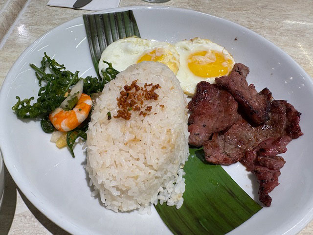 頼んだのはフィリピン定番の朝食「タプシログ」。ビーフタパが他より分厚くて食べごたえありでリッチ気分。ただし野菜はゼロ。気の利く奥さんが別途「パコサラダ」を注文してくれました。