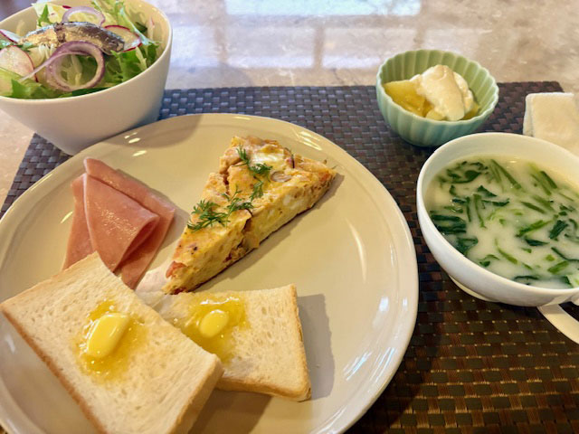 朝食は、サーディンの乗ったサラダボウルがうれしい一皿。クリームスープにはほうれん草が入っていて、野菜しっかり。タンパク質や脂質とのバランスもよかったんじゃないかなと思います。