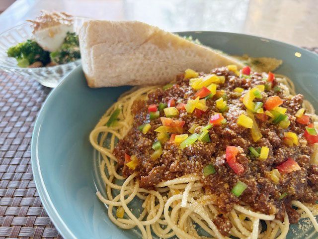 ランチは、ミートソーススパゲッティ。玉ねぎや人参は、フードプロセッサー嫌いの奥さんの方針で、手でちゃんとみじん切りの愛情こもったミートソース。