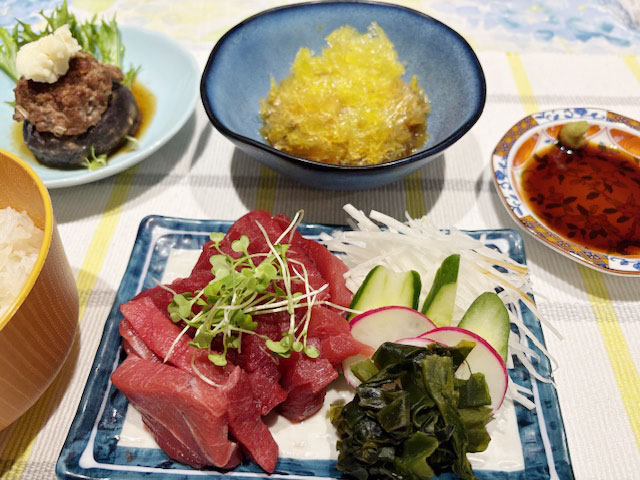 夕食でついに、昨日購入してきた今年初の本マグロ(クロマグロ:ブルーフィンツナ)が登場。お刺身定食で提供されました。マグロ以外にも、付け合わせにわかめがついていたり、海藻サラダも。