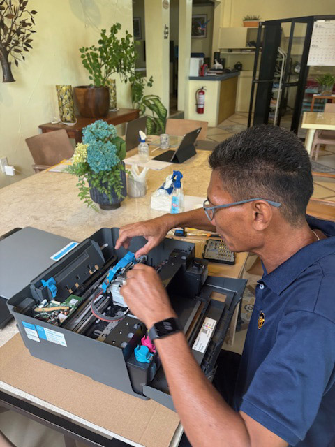 ダイバーさんが出たあとのリゾート内では、ガードマンがプリンタ修理。電気系統ではなくて、インクのチューブに気泡が入ったのを取り除く作業。