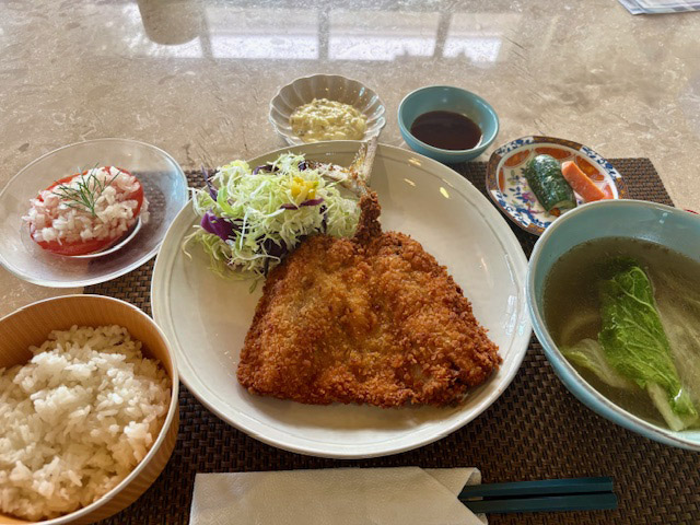 ランチは、先日カルティマールで仕入れて、「開きにするのを見張っていた」アジを使った、アジフライ定食。ランチョンマットからはみ出す勢いで出てきました。