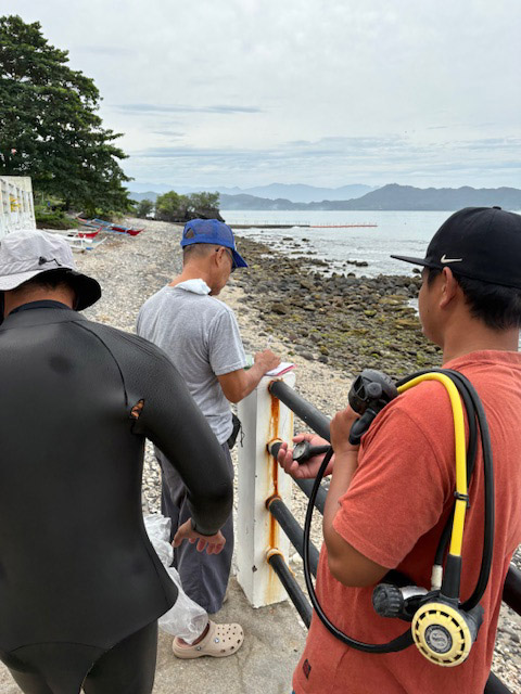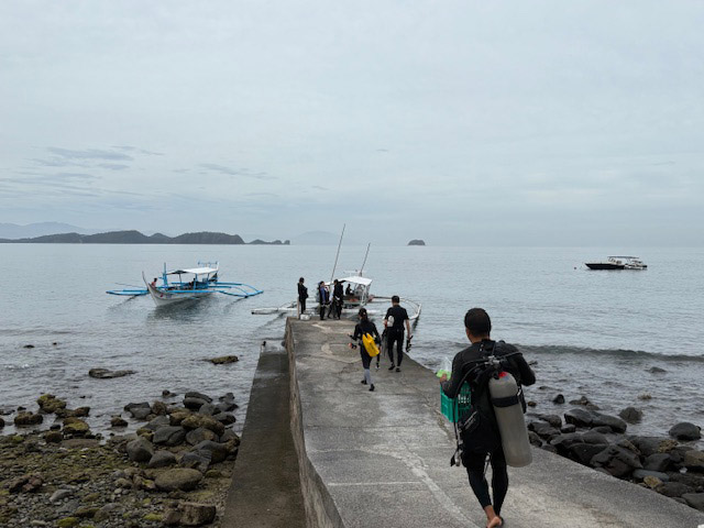 ダイブパスの運用が今年1月から変わっていて、島側と半島側で分かれています。ボート出発ギリギリまで決まらないのですが、今日は半島側に行くことに。ベージュと仲良しの村の係のおじさんがチェックしてから出発です。