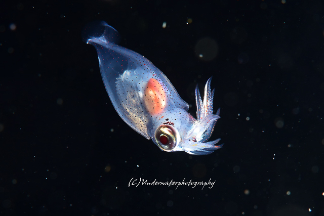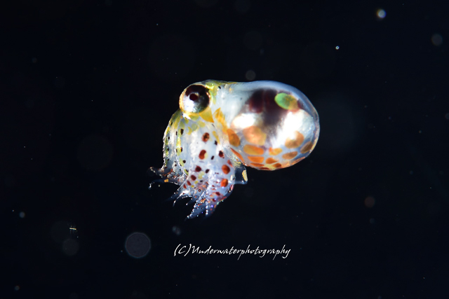 浮遊系のタコちゃん。足が短めで、なんとも愛嬌があります。イカもいました。小さくても内臓はピンクにしっかり主張。目が大きくて可愛い。