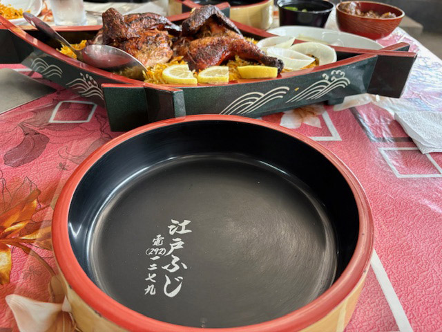 取り皿も、通常はスプーンとフォークの使いやすい平皿のところに、まさかの丸い寿司桶。「江戸ふじ」と書いてあったので検索してみましたが、この電話番号の江戸富士さんはすでに廃業の様子。東京や愛知の有名店とも違うようで、どこから来たのかは分からず。