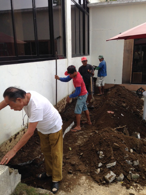 昨日の基礎確認を踏まえて、拡張ダイニングエリアと新キッチンの工事を始めました。ゴールデンウィークまでの目標は、新ダイニングの柱の基礎と柱の一部の完成と、新キッチンの配管埋め込み、床の一部のコンクリ流しです。