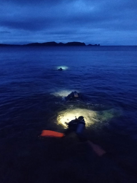 まだ薄暗い時間帯で、海に向かうとほぼサンセットダイブくらいの暗さでしょうか。ライトを使いながら、静かに潜っていかれました。朝のこの時間帯独特の、音の少ない海はとても良いものですが、生き物がほぼ寝ているのが玉に瑕。朝の海の雰囲気そのものを楽しむ、「大人な」ダイビングです。