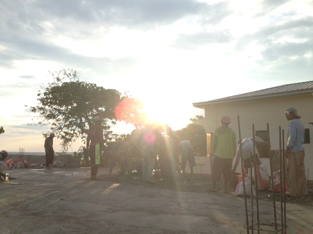 旧ダイニングの2階床部分のスラブを打ちました。大きな梁がなかったので、午後9時30分には終了。スラブ打ちの翌日は通常は休みにしているのですが、拡張ダイニングの仕上げを早くしたいのと、今日早めに終わったので、左官屋さんには明日出てもらうことにしました。