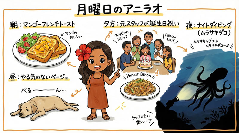 本日も日本からゲストがいらしていますので、朝からしっかり食べてダイビングに行きたいところ。朝食は、みんな大好きマンゴーのフレンチトーストでした。