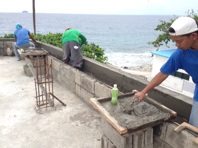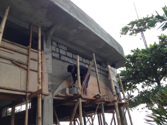 ダイニングの工事。拡張側のアーチ上部のブロック積み、拡張側屋根上の花壇の仕上げ、旧ダイニングの補修のための梁設置などでした。