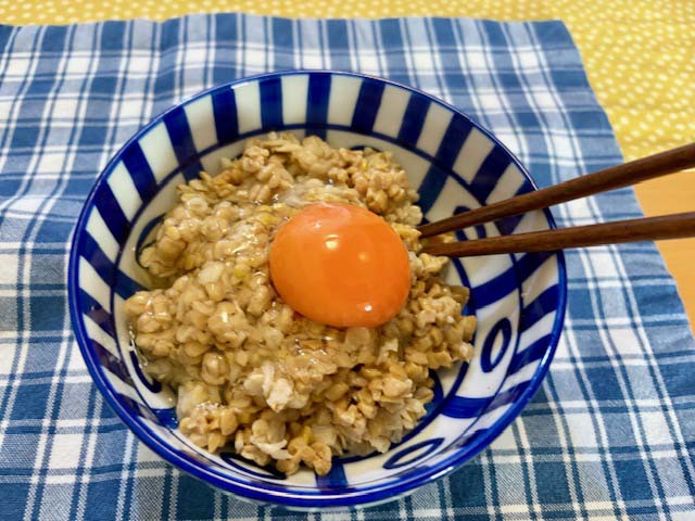 と、その前に朝ご飯。やろうやろうと思っていて実現していなかった「オートミールごはん+納豆+生卵」の、ボディビルダー推薦のメニュー。