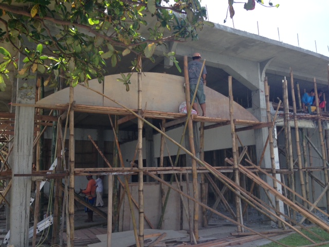 拡張ダイニングの工事は、古い部分の梁の撤去と、アーチづくりの準備。旧ダイニングの上の梁のづくりの準備もしています。