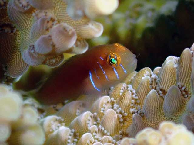 サンゴの隙間に潜む撮影困難なアカネコバンハゼも。さらに、極小なので私はスルーしたポントニデス・マルディブエンシスの透け個体も、ばっちり記録されていました。写真提供、サウザンシャインさん。ありがとうございました。